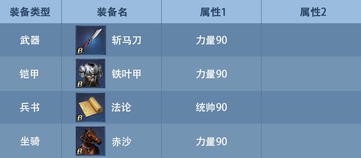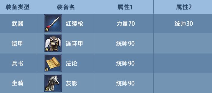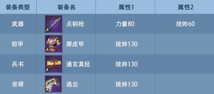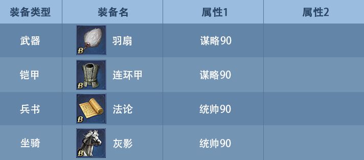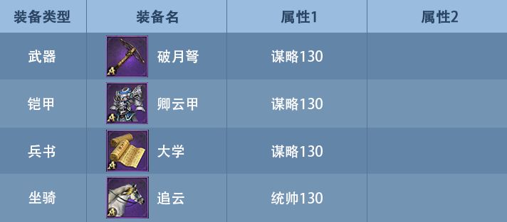 装备搭配:主谋略装,谋略越高 伤害越高。适当搭配统帅装,加厚血量。