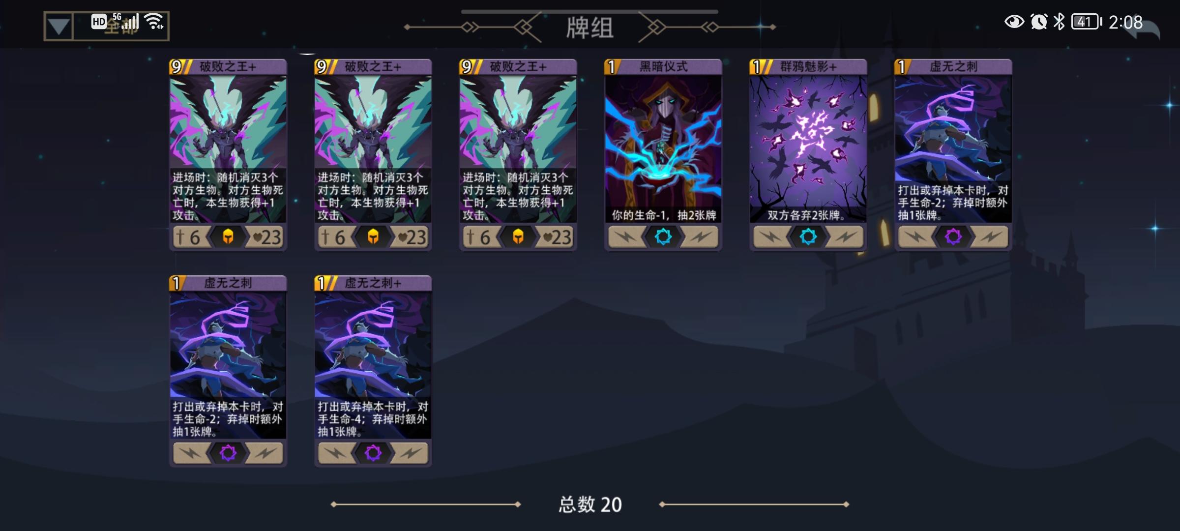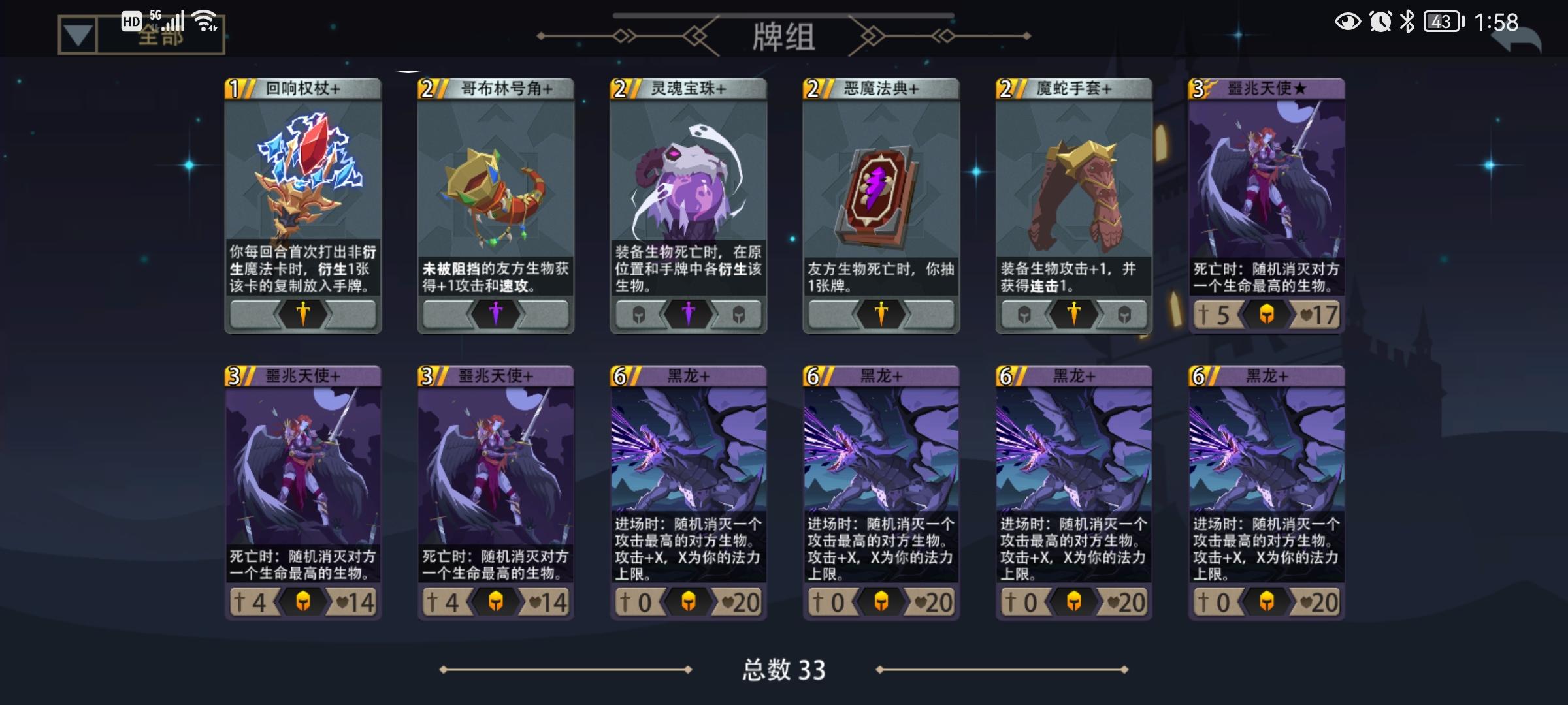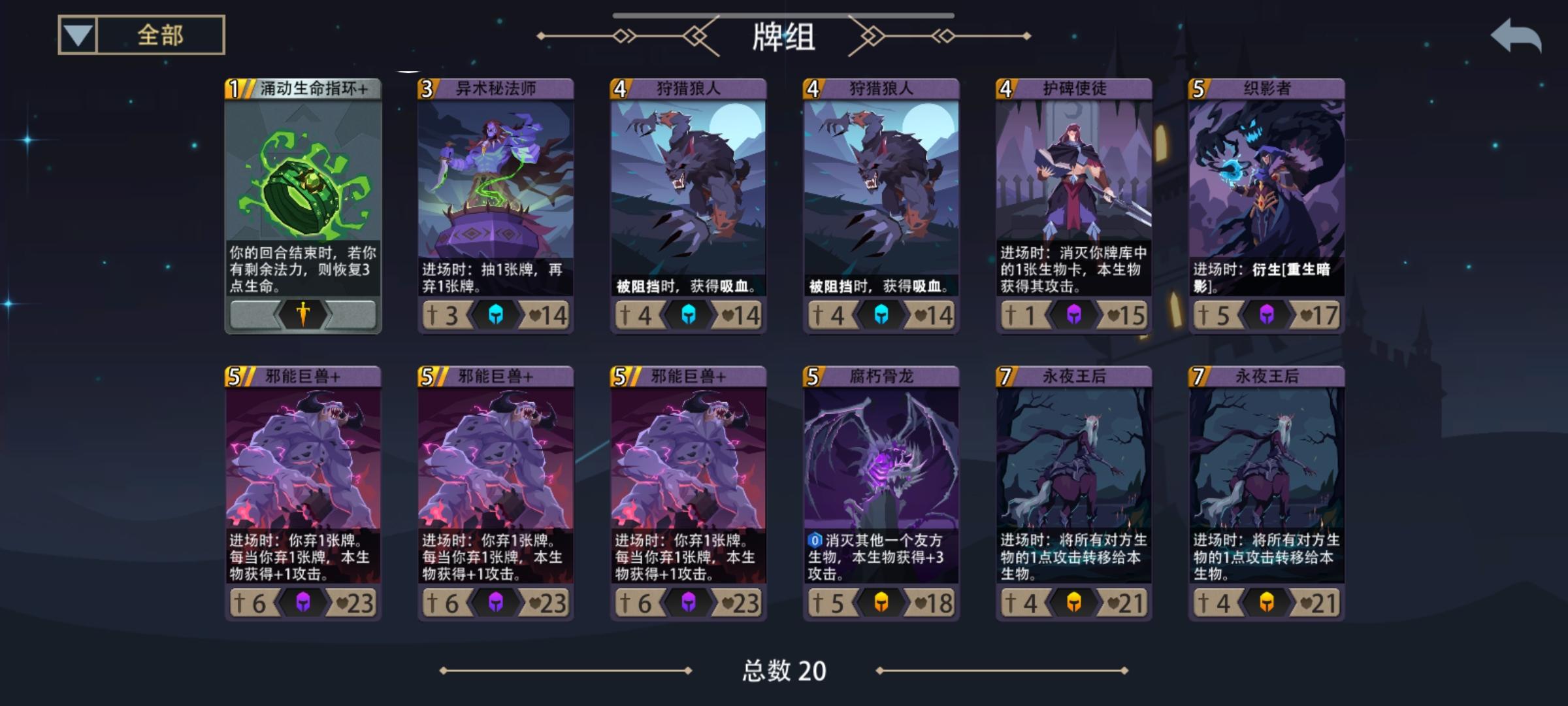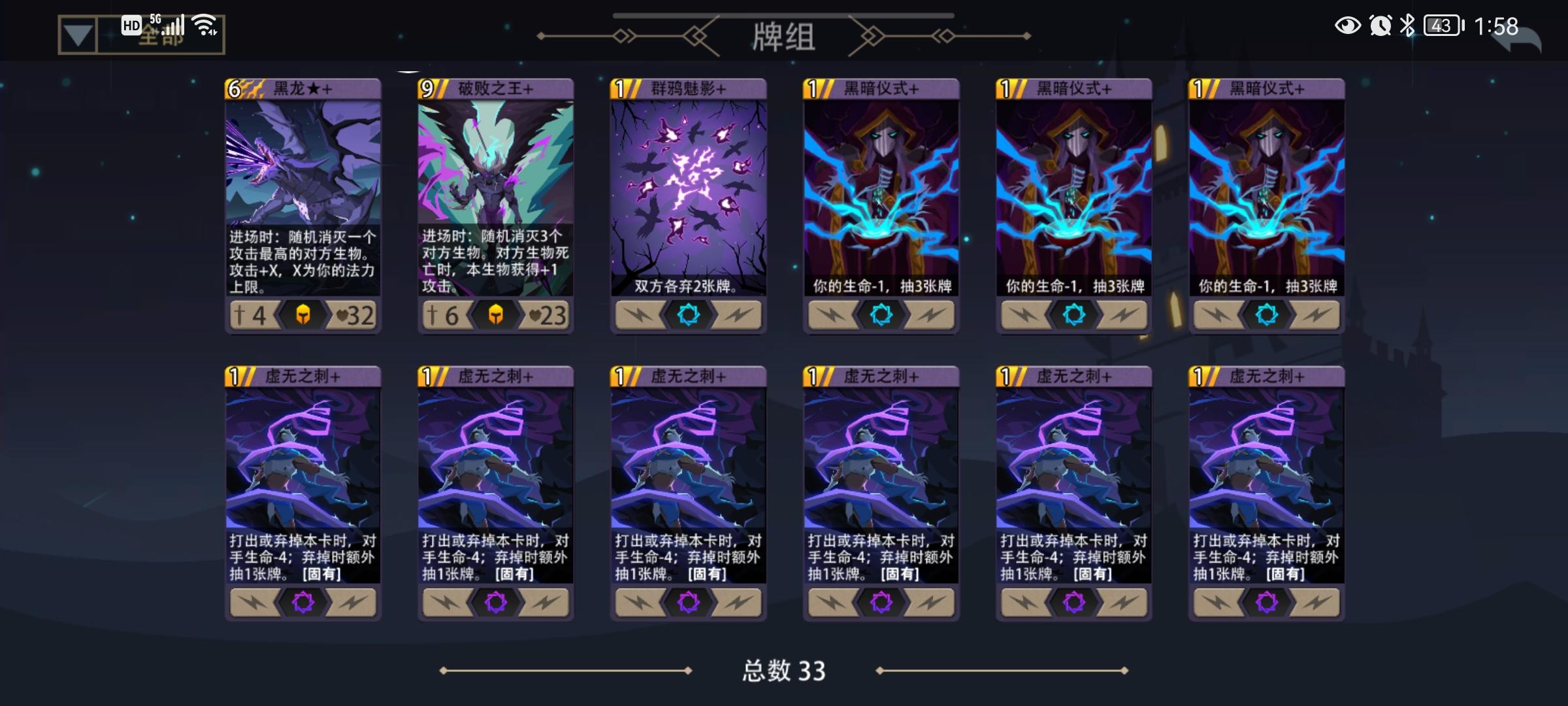 整个流程简单粗暴,所有拿牌的道具全要,能固有虚无之刺直接固有,其他都不用固有,前期抓不到黑龙、破败之王的时候有噩兆天使先抓两张,用骨龙杀死给骨龙加攻回血顺带清场,其他有什么用什么,法术牌用虚无之刺、黑暗仪式、群鸦邪影过牌,另外拿一到两张极夜降临随时掀桌子😂一般情况下黑龙进场最少10攻基本上场上就没对面怪,发牌不好时候可以掀桌子重来。