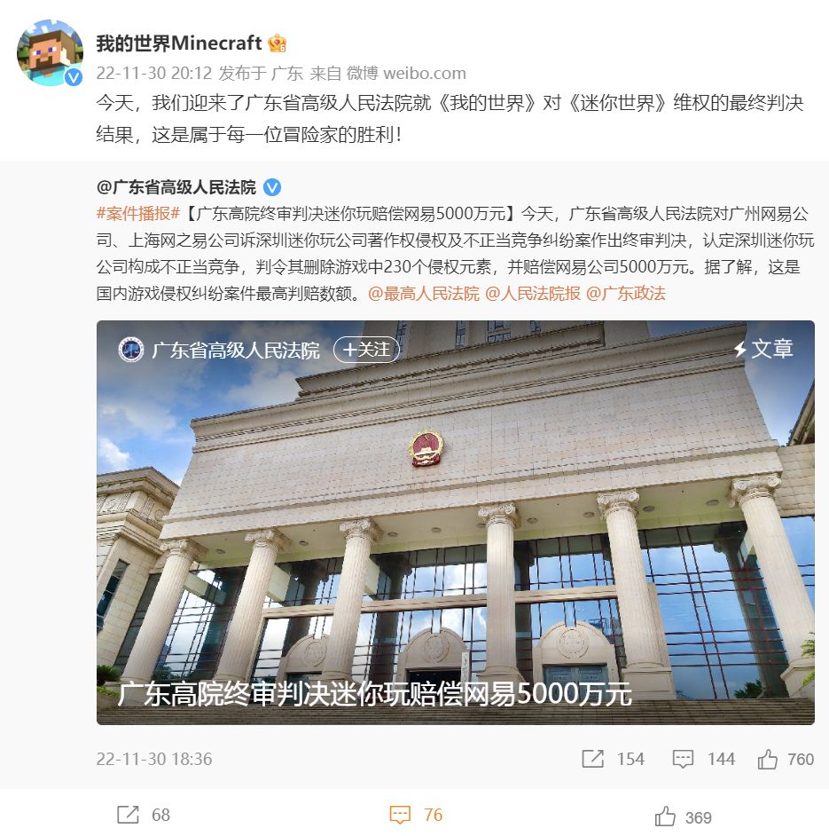 广东省高级人民法院对广州网易公司、上海网之易公司诉深圳迷你玩公司著作权侵权及不正当竞争纠纷案昨日(11 月 30 日)作出终审判决,认定深圳迷你玩公司构成不正当竞争,判令其删除游戏中 230 个侵权元素,并赔偿网易公司 5000 万元。这也是国内游戏侵权纠纷案件最高判赔数额。