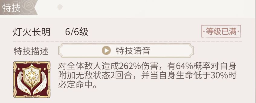 特技无敌概率34%~64%,必中血线8%~30%,特技升级收益可观。理论伤害26996,很高。