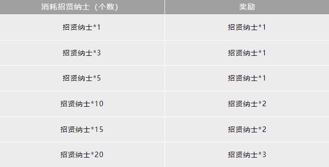 活动期间,累计消耗一定数值的「招贤纳士」将可以获得对应数量的「招贤纳士」。