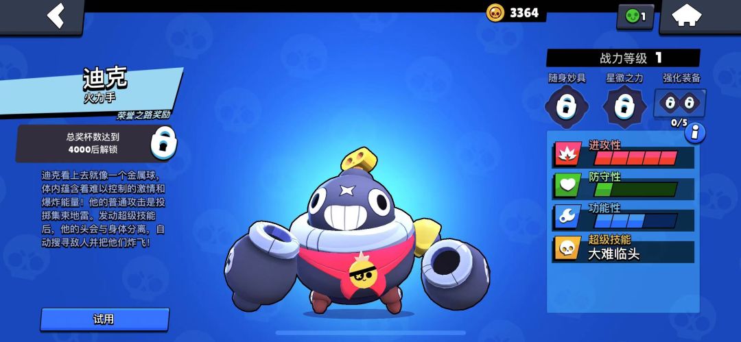 迪克的超级技能-大难临头,迪克发动“自杀式”袭击,扔出大头和敌人同归于尽,微型地雷命中六次即可充能完毕,但是需要注意的是大头释放后会有短暂停顿而且大头也会受到控制效果。因此老练的迪克玩家会谨慎选择大头的落点,避免大头在冲刺途中就被敌人打掉,同样,大头自动索敌的攻击机制也可以找出藏在草丛中的玩家,让他们猝不及防地天降正义。四:迪克妙具七级后的迪克拥有了更多折磨对手的手段(1)疯狂分裂迪克下一次的普攻将会分裂出六颗微型地雷,需要注意的是疯狂分裂发射出的微型地雷和普攻的一样,地雷的散布间距会随着投掷的距离发生变化越近散布越小,越远散布越高,所以紧急时刻本妙具可以投掷到脚下,阻止敌方突袭者突脸(2)最后一搏迪克获得减伤负重,护盾失效时对近身敌人造成伤害并击退,配合大招使用可以打出二段控大大增强了迪克的生存能力避免遇铲即亡的冥场面。