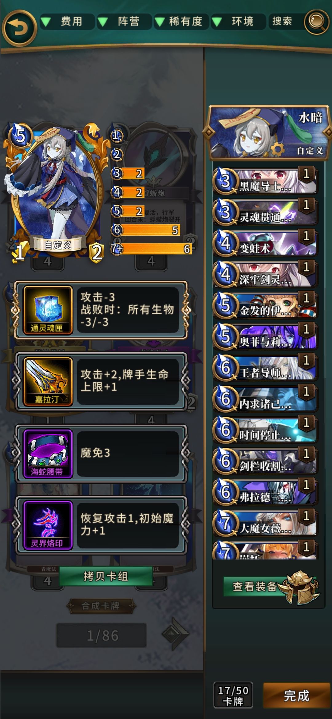 如图所示这就是卡美洛和帝国环境比较实用的单卡,因为你游50卡的构筑前提,所以构筑会相对自由很多,如果抽到上述就可以考虑带上。其中穿刺剑兰三世饥荒和终焉作为德古拉的五朝元老目前很多主流构筑依然会进行携带,如果对德古拉有强烈使用兴趣的强烈推荐进行合成,内求诸己这卡也是最近刚出的强力单卡很好的补足了德古拉后期大哥过少的问题。魔眼和崩坏作为开荒比较强力的单解效果会不错,不过随着box的提升会逐渐被其他卡所替代,毕竟纯爱天下第一!