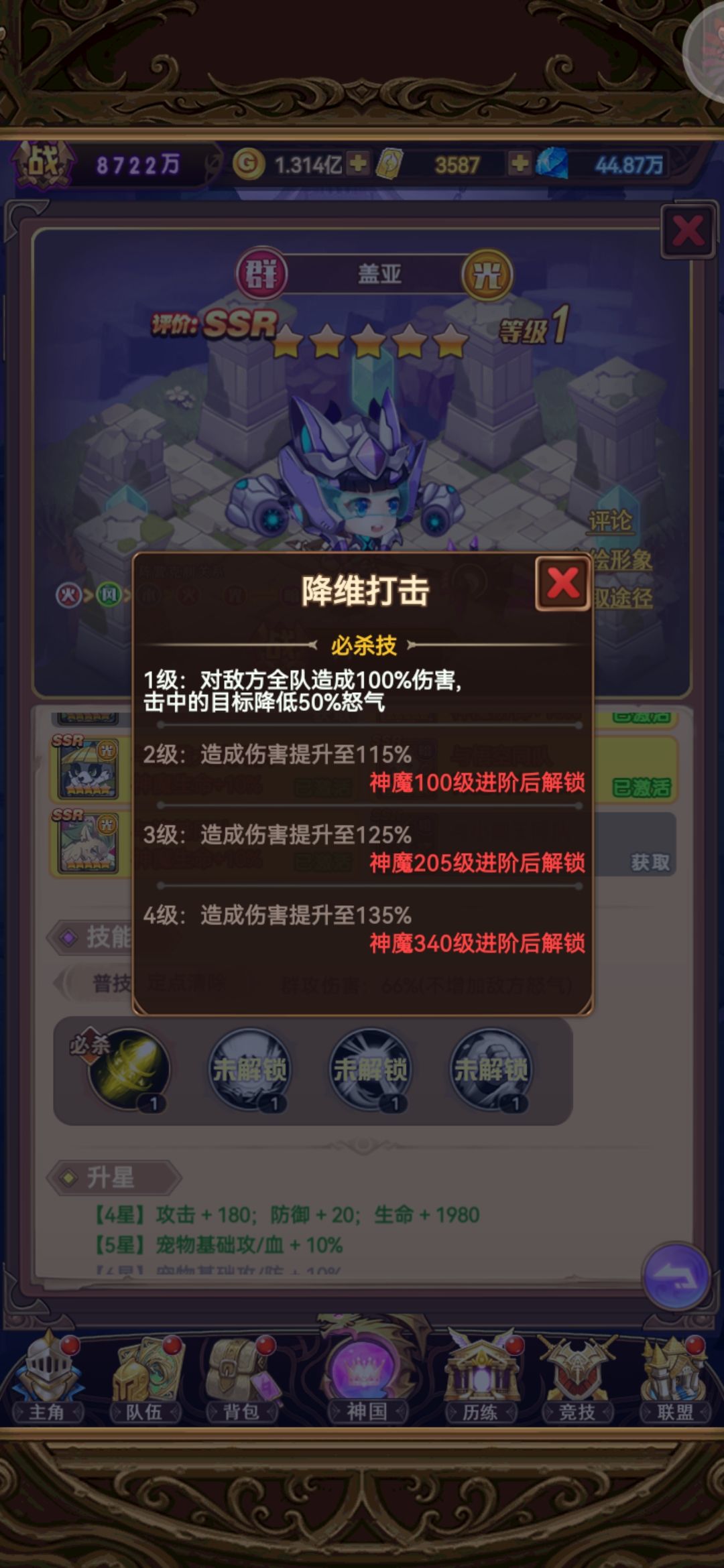 6.养成曲线顺滑。盖亚的养成活动是很重要的一部分,给好多养成材料,还能给神戒这种氪金产品。本身也要养。大后期可以替代3系的群攻选手成为主c。