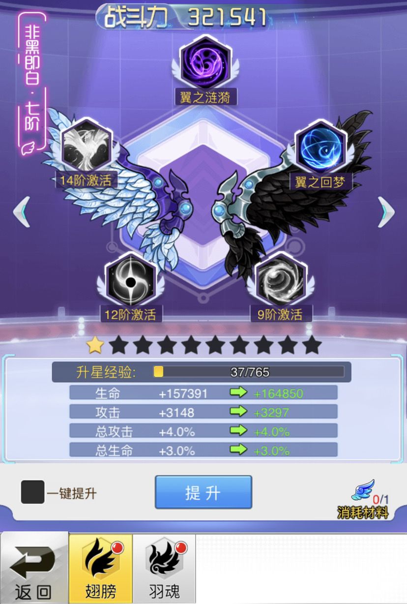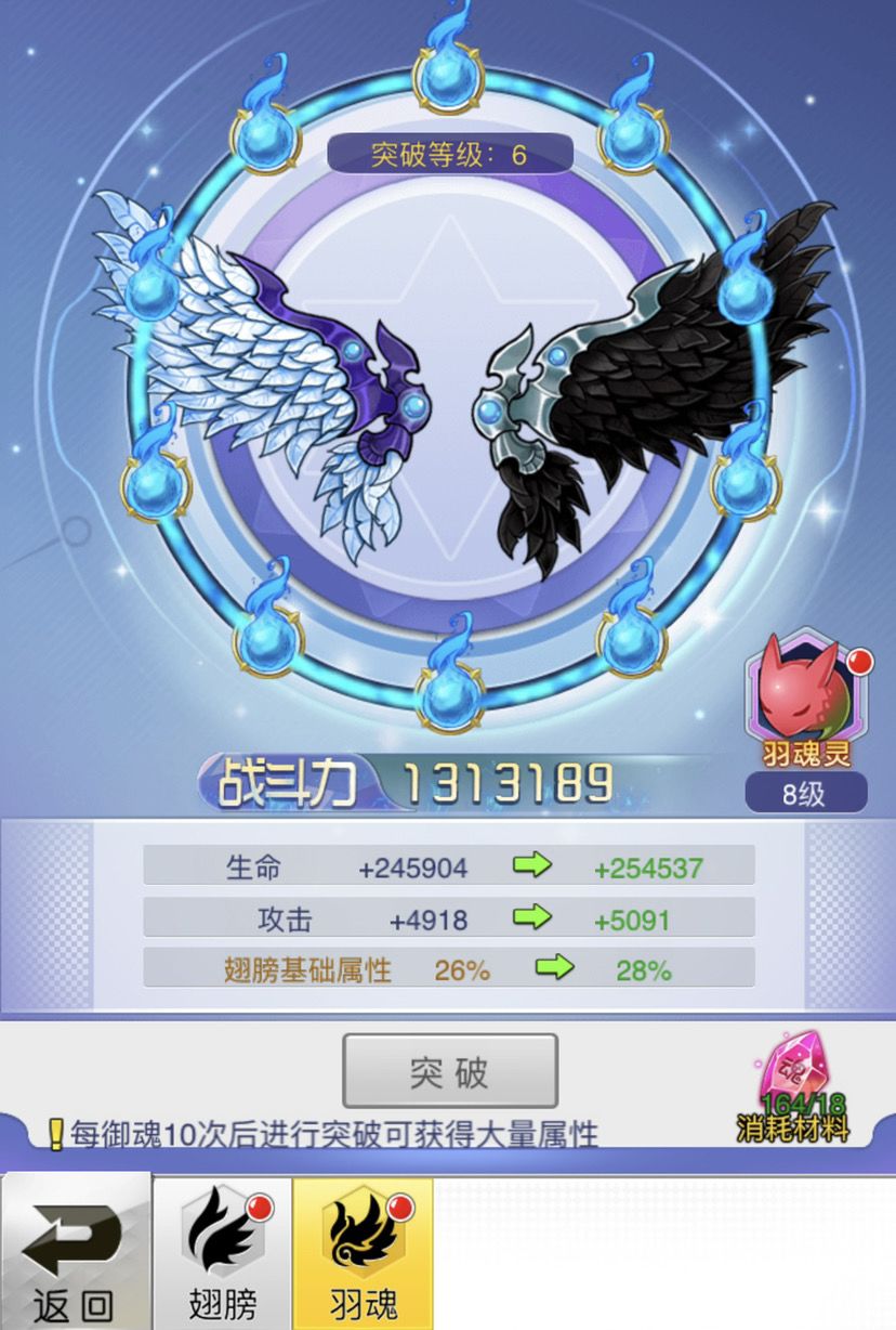 第一天【羽魂】:打开翅膀系统【羽毛升级】(优先主角①号升级,再给每个副角②—⑤号升级,因为主角会有升级的前置条件)平均升级的战力最高。【羽魂升级】御魂晶同理优先主角,其次副角,羽魂灵提升的最多噢(羽魂灵只给主角)。