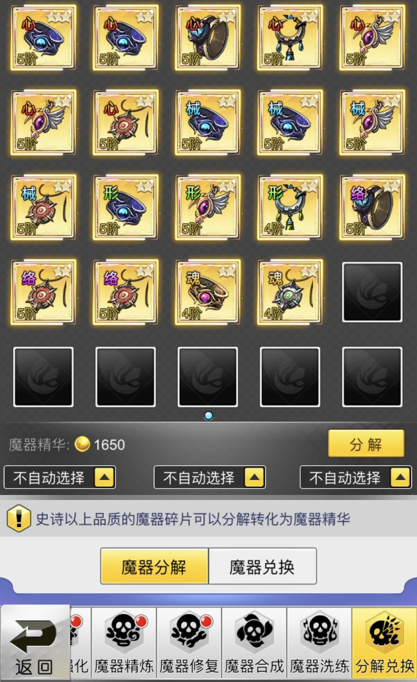 【分解】:不需要的魔器可分解之后兑换所需的5阶魔器(只有5阶魔器可以进阶天阶)