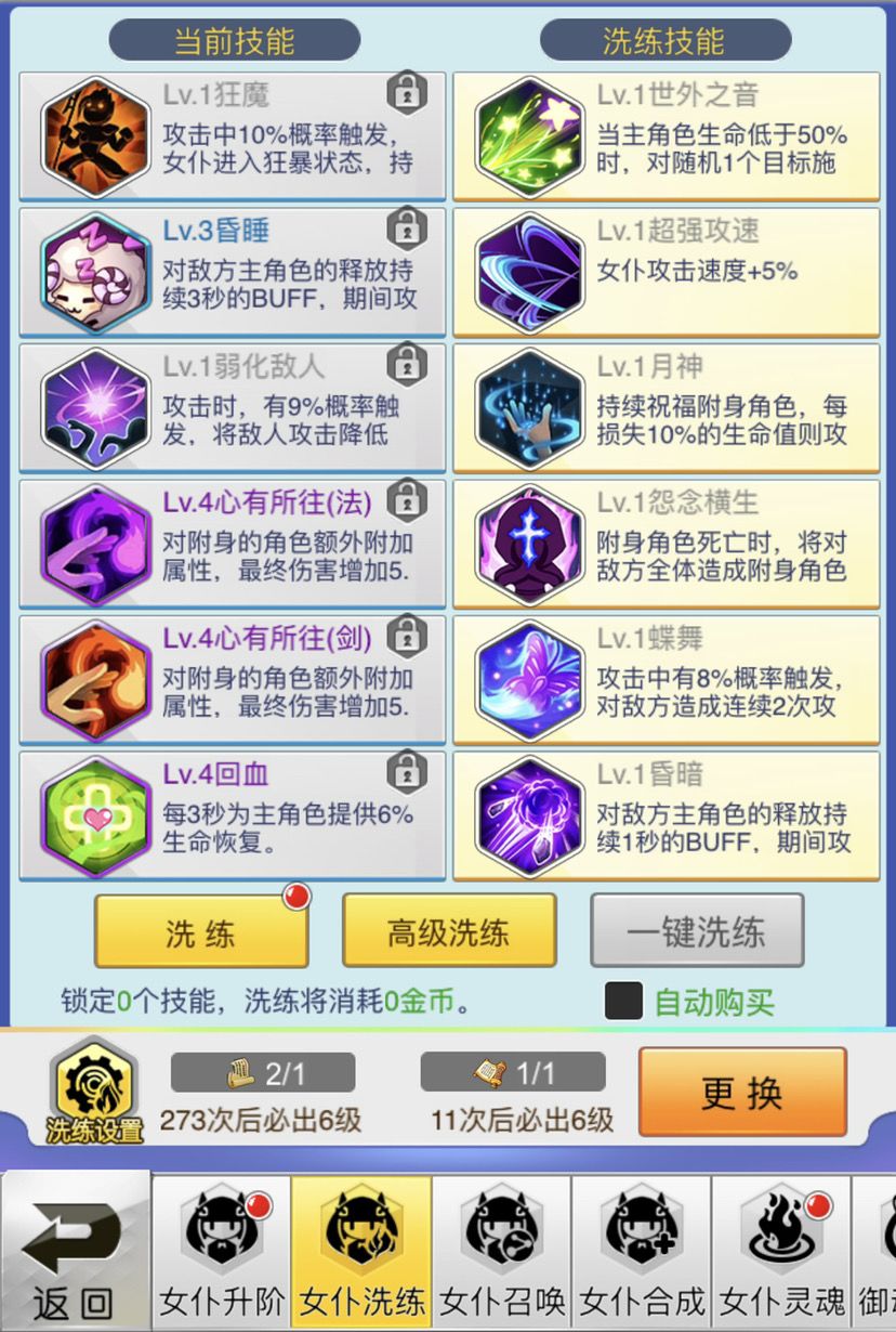 【技能】:前期洗出5-6级的技能概率较低,所以这里暂时只推荐洗出心有所往和附身加属性的技能(会为对应的角色职业增加附身战力)后期技能攻略具体参考【嬴政大佬的女仆攻略】,小的只负责二跨😂