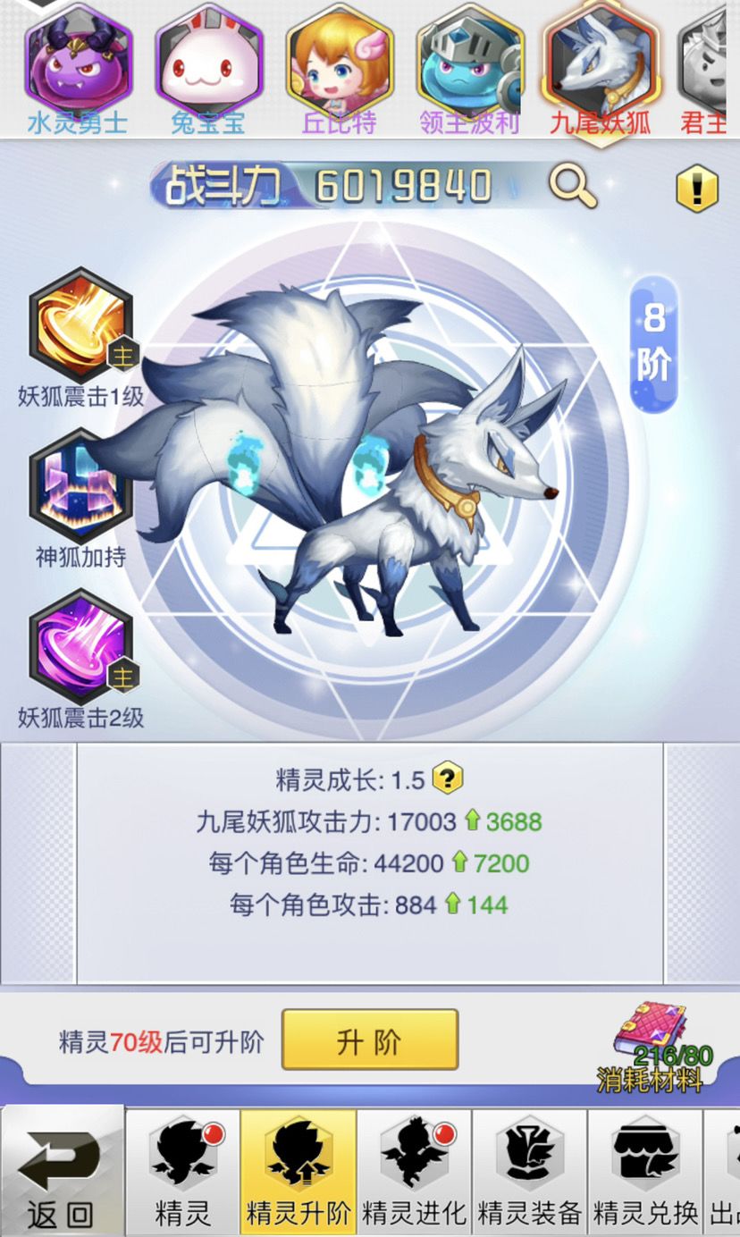 第七天【精灵】:打开精灵系统:将所做精灵激活并升级进阶(优先九尾,可在前些天的礼包中购买)