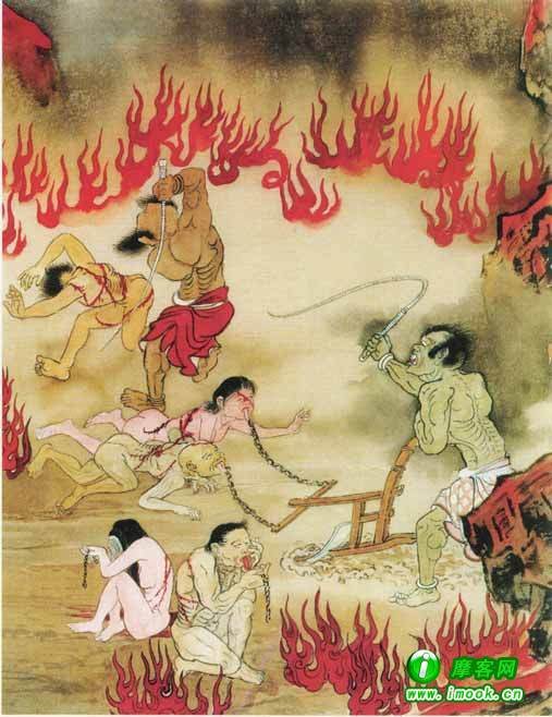 下油锅**嫖娼,盗贼抢劫,欺善凌弱,诬告诽谤他人,吃动物肉者,谋占他人财产,妻室之人,死后打入油锅地狱,剥光衣服投入热油锅内翻炸,啪,啪直响!依据情节轻重,判炸多遍……有时罪孽深重之人,刚从冰山地狱里出来,又被小鬼押送到油锅地狱里暖和暖和……此为上九层,即东地狱,可见地狱何其多也,并非董某手误。而《水陆全图》中的下九层的西地狱,则更为残酷……平常人们所说的十八层地狱,数目是对了,但从意义上却不见得理解。《十八泥犁经》中讲到这十八层的差别,最主要不在于空间的上下,而在于时间和刑法上的不同,尤其时间上。