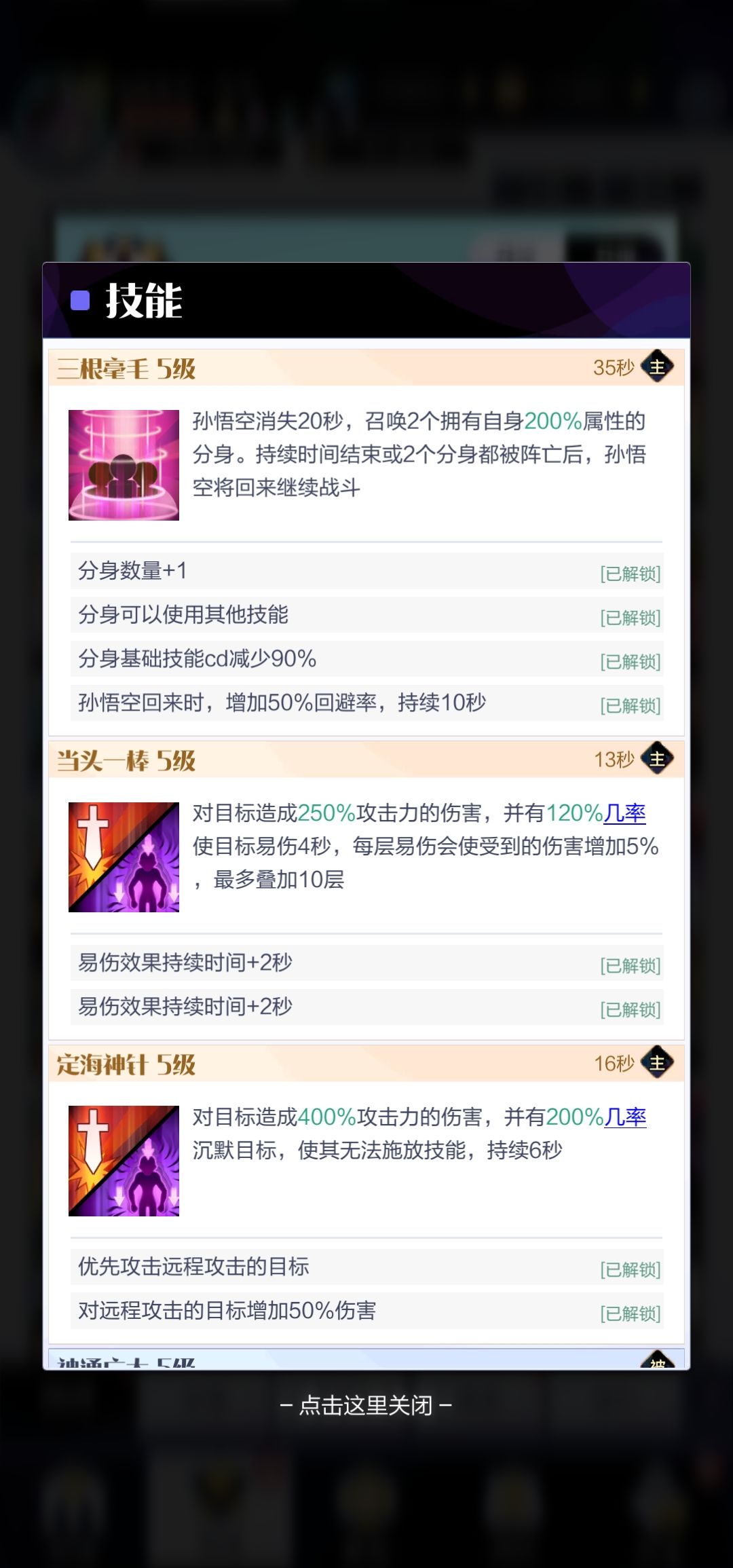 进入正题。身为版本强势阵容,对于阵容的门槛还是比较高的,需要先机和娴熟命石配合阵容搭配才会有很好的效果。先机和娴熟效果如下图,先机7可以在战斗开始前减少主动技能90%的cd,娴熟7则是减50%技能cd,加持这两个buff后,孙悟空的分身技能几乎可以不间断释放,抵挡大量伤害,提供大量输出。