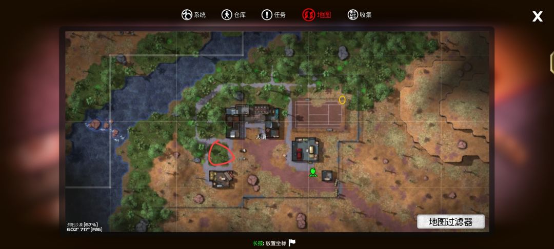 红圈是枯萎白树,黄圈是白树后棒球场东北角位置,但是有点难挖到