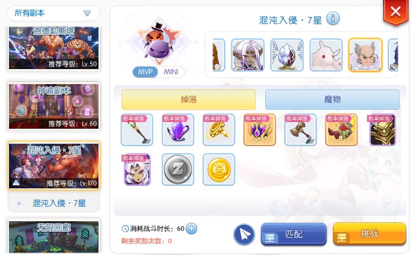 随机组合:每日刷新,同时产出两种mvp,可在副本界面内点击掉落详细了解,如上图所示
