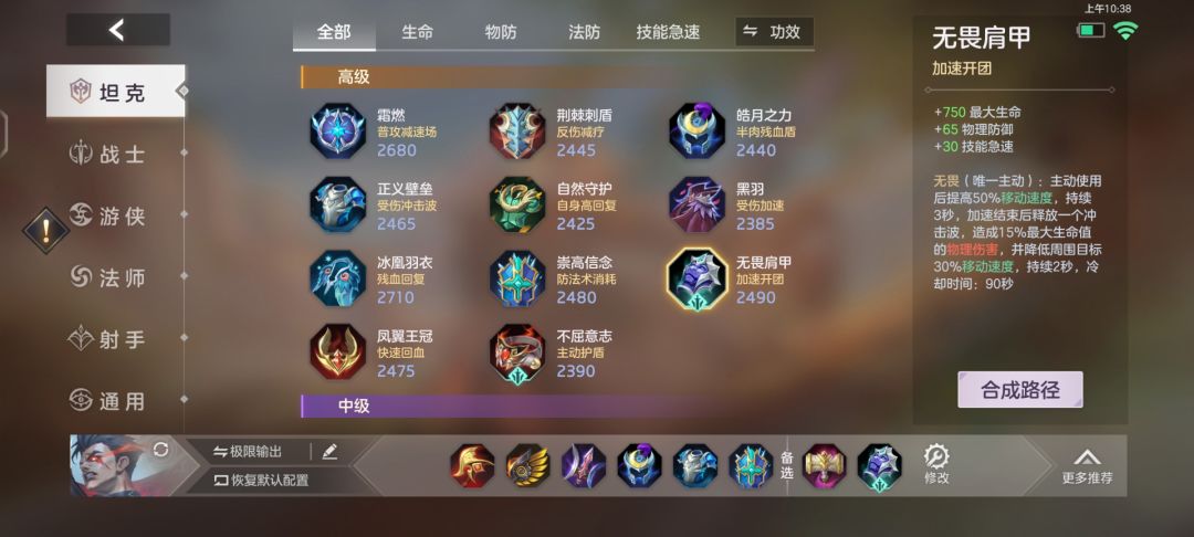 如果觉得只是辅助不过瘾,就出两个输出装备,提高伤害,对面控制很多的情况就出崇高防止连招过程被打断,控制不多就带肩甲开团