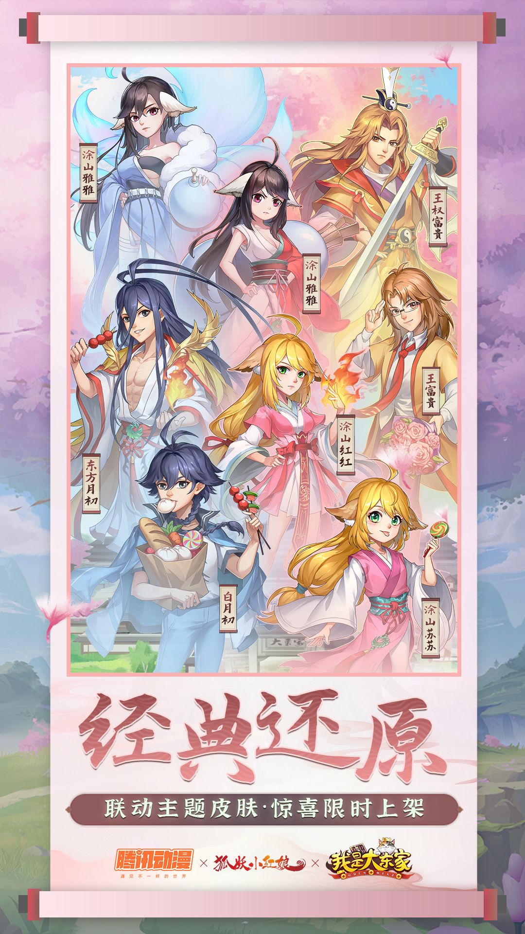 《狐妖小红娘》人气角色悉数登场,同款经典形象限时获取:背负前世情缘、努力成为最强红线仙的白月初和涂山苏苏,心怀两族止戈愿景、真爱跨越五百年的东方月初和涂山红红,高傲冷漠法力高强的涂山雅雅,人兵一体向往自由的王权富贵,自信多金的王富贵齐齐入驻《我是大东家》,各位东家可在游戏联动玩法中集齐解锁道具,狐妖小红娘与你一起闯荡商界!