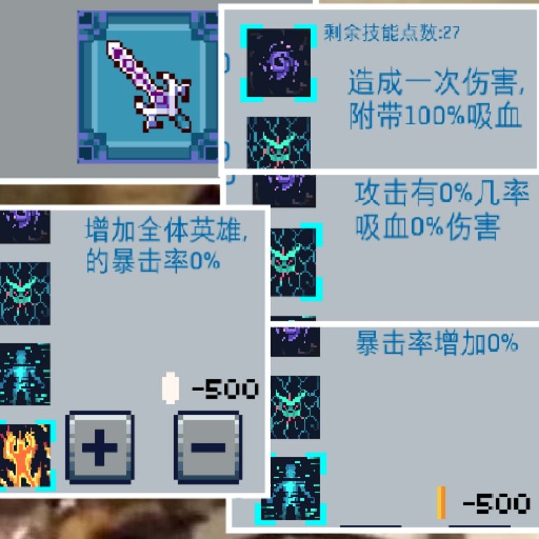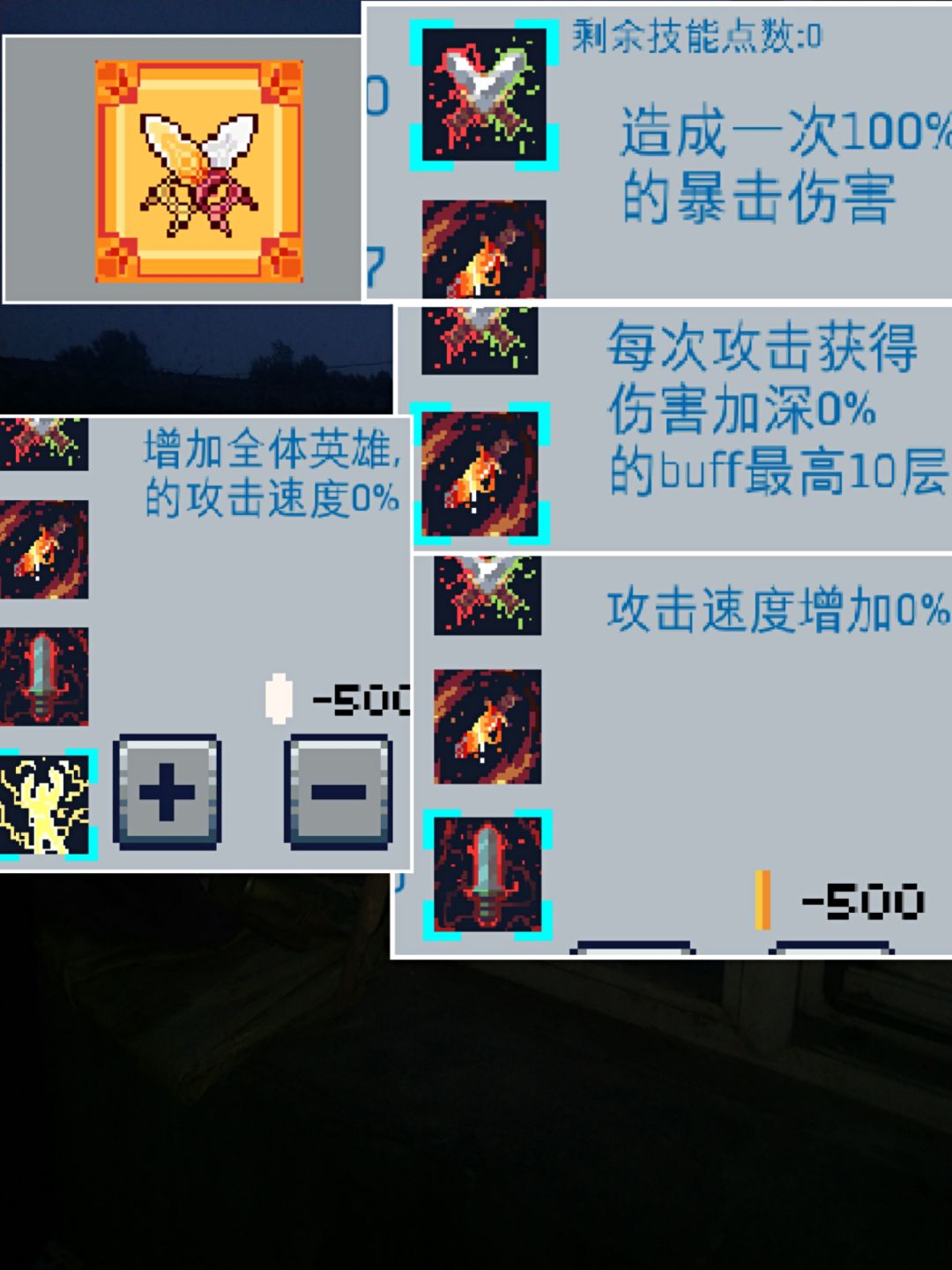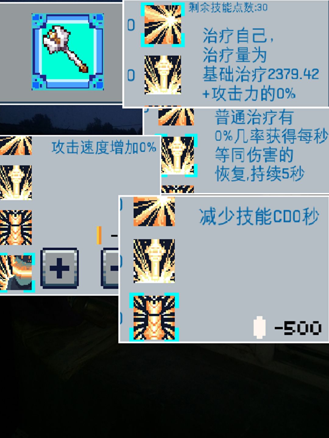 一技能每级增加30%伤害(沉默状态下怪物无法放技能:并且可以打断boss技能:可能可以破除无敌)lllll二技能每级增加1%暴击加持概率(暴击加持buff并没有详细图标触发了也看不见)lllll三技能每级减少一技能1秒cdlllll四技能每级减少0.5秒cd和增加20%技能伤害