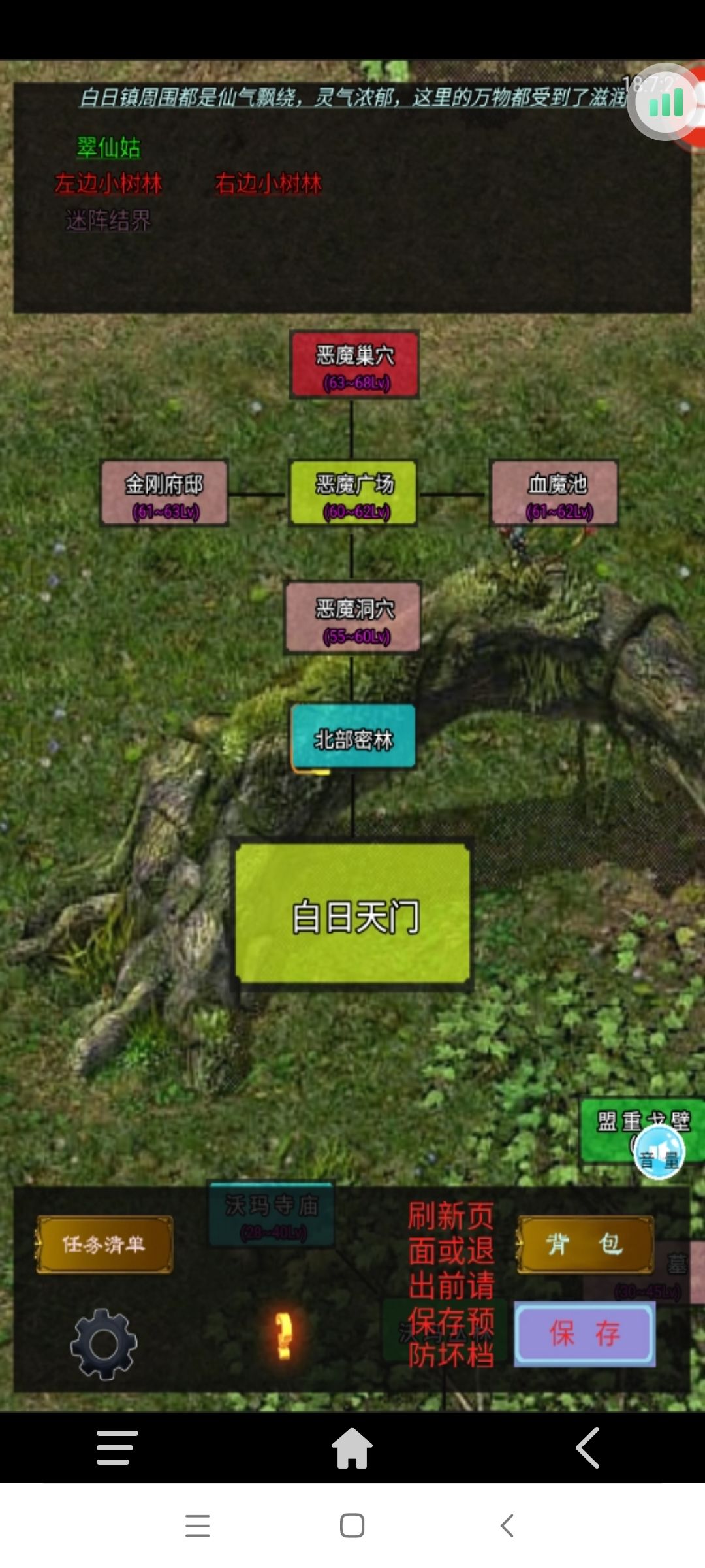 2、到了白日门就看到两个npc,把任务接了,需求99魔气,99灵气。这个任务必须做,才能开始后续主线任务。然后往上走,小树林左右都行,打灵气和魔气。鸡还爆铭文石和强化石,从此以后这两种不缺啦。出图调好设置的自动吃药,豆子每个回一半血量,根据你现有生命值设置。
