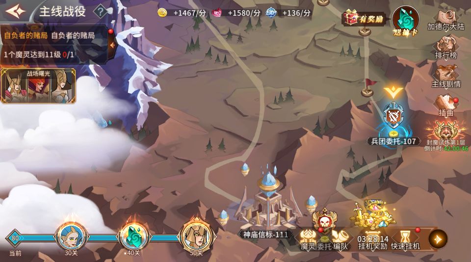 主线战役虽为整个游戏的支柱性功能,但其玩法相对来说比较简单,无非就是想办法提升战力尽量通关,从未提升角色等级、解锁功能、获得资源和道具将等等;唯一需要注意的就是,每一个关卡均设有不同的难度,需要您不断的变化魔灵搭配布阵争取快速通关。