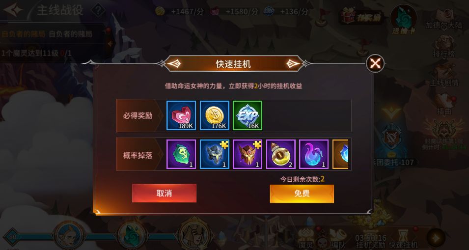 挂机奖励和快速挂机奖励的丰厚层度与您通关主线关卡数量相关,故建议每日登录游戏后优先领取挂机奖励,培养魔灵和装备进行战斗提升,并最大限度通关主线关卡后,再进行快速挂机兑换操作,以便收益的最大化(提升VIP等级可增加挂机时长,以及增加快速挂机兑换次数)。