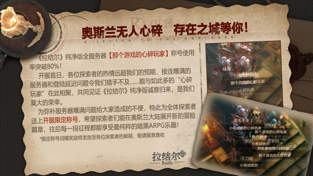 开服首日,各位探索者的热情远超我们的预期,接连爆满的服务器和登录延迟问题令我们措手不及,能与如此多的”心碎玩家“相聚在此,共同见证《拉结尔》纯净版的诚意归来,是我们莫大的荣幸。