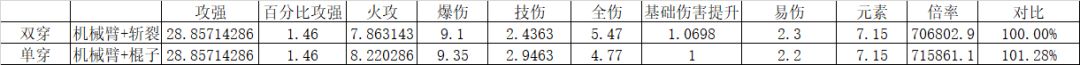 所以,在你斩裂剑不舍得洗攻强,爆伤,首领的前提下,机械臂+棍依旧强于机械臂+斩裂剑,当然强的并不多,甚至实战因为偶像或者武器伤害稍微波动一下,都看不出变化。