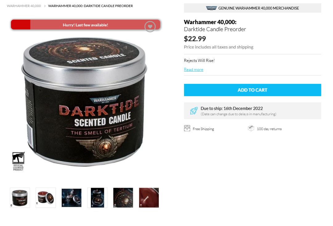 这实际上也并不是第一款《战锤40K》有关的香薰蜡烛。去年 Merchoid 发布了一系列的 40K 主题节日蜡烛,香味的名字也都非常符合这个世界,像是“死亡世界的气味”、“妄想的气味”等等。据说他们的销量非常不错,也催生了《暗潮》主题的熏香蜡烛。