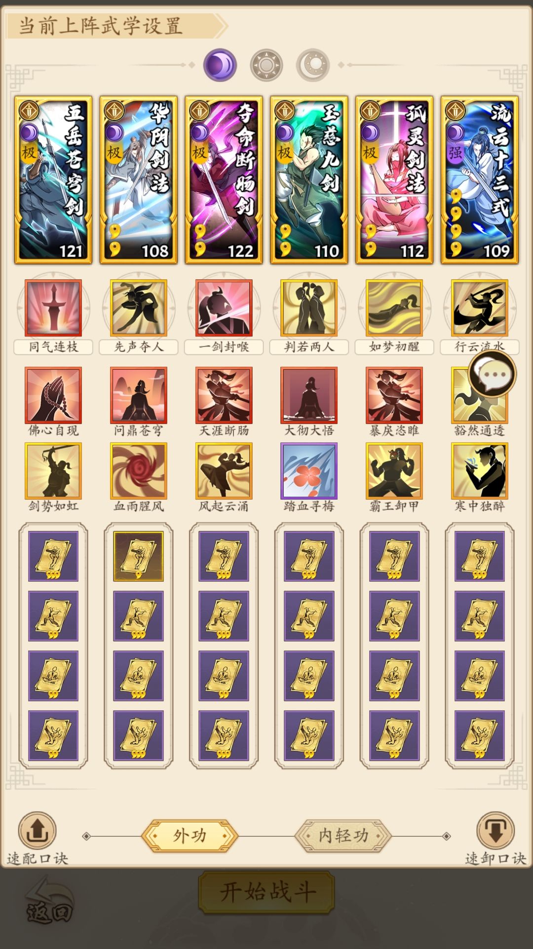 理想卡组为:五岳苍穹剑–幻影剑法–寒苍剑法–悟明剑法–玉慈九剑–流云十三式