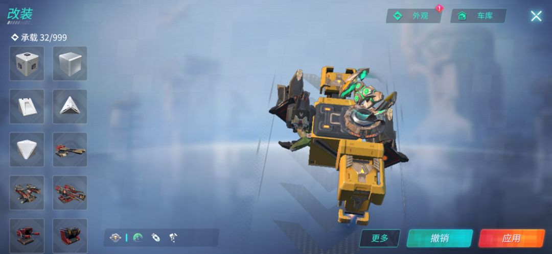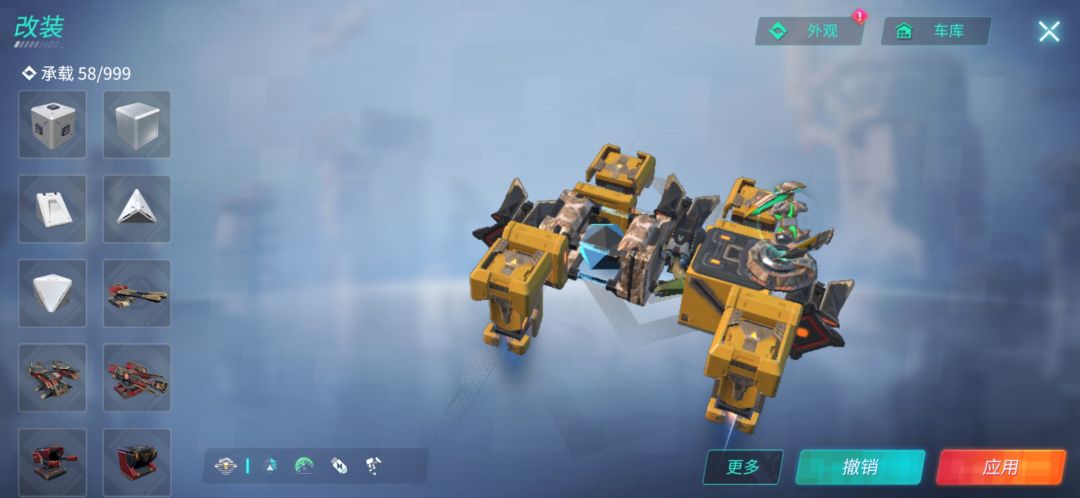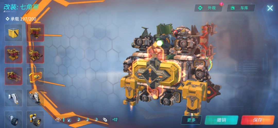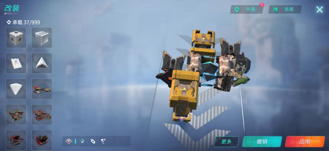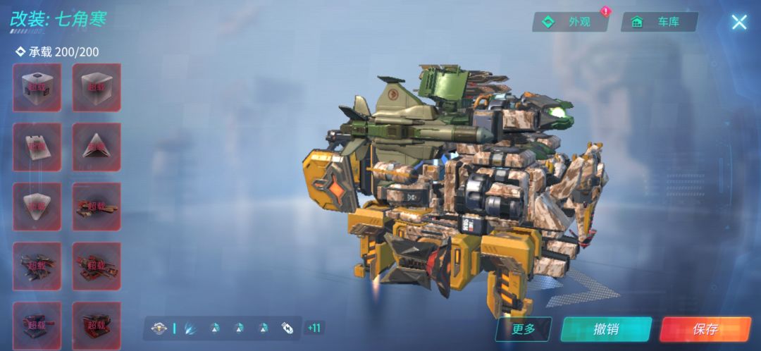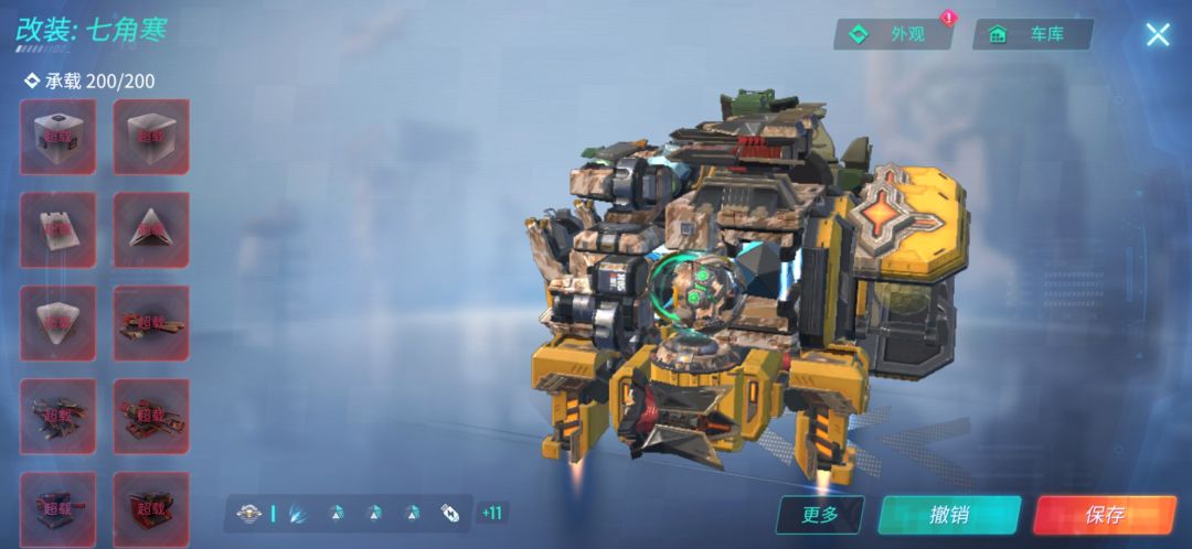 这辆车装备了五个隐身,可以一直保持隐身状态。三个大力神可以使其在擂台达到260左右的速度,终极技能比较全,因为这个车子没有什么防御,所以可以根据个人喜好装上重盾(如下图)