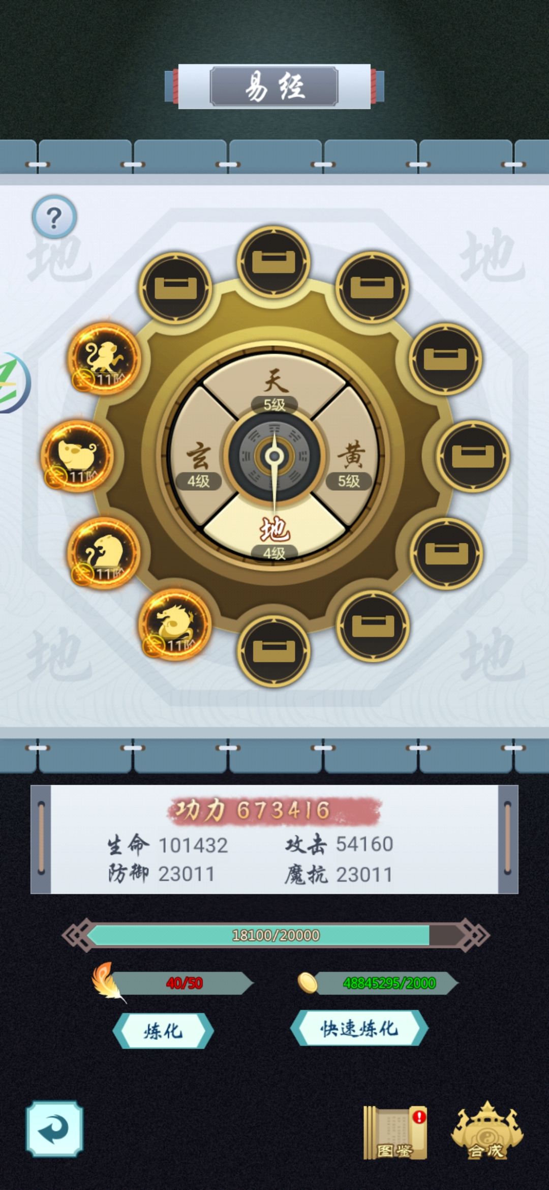 群侠挂机里面的易经板块,可玩性还是比较高的,对战力的提升很明显,大家都知道金属性生肖加战力最高,但我觉得前期不应该追求四套金,这样后面生肖升级会很慢,金属性生肖可以开宝箱获得,所以最多,但后面升级的数目很庞大,到升十级金属性的时候,后面在想升没有充值的加持的话,会很慢,慢的你根本就根本想不到,这东西升级的话要多久,所以我劝大家前期放个木属性同级升,木属性比金低,但十一阶木比十阶金同生肖,还是会强上一点,三金一木同时升,会比四金快不少,而且战力不会低。天地玄黄同时升,不要追求先升一个,这样看似升战力快,但后期战力升不动,同时升虽然前面慢点,但后面战力提升明显!