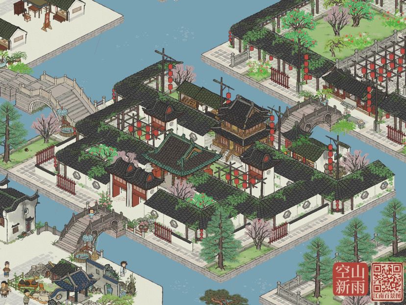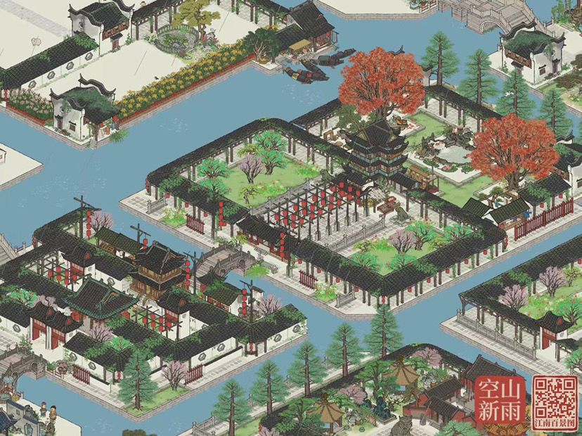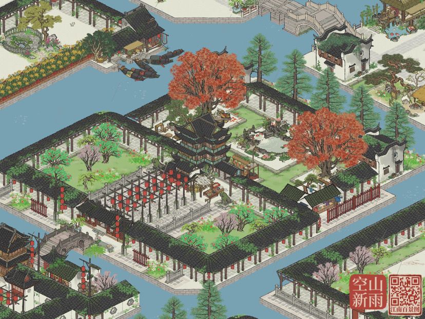 将茶叶店藏在商行后面,呈现视角就只露出树来做装饰,两颗落枫吸引大家从而可以掩饰成衣店不能满足对称感的需求
