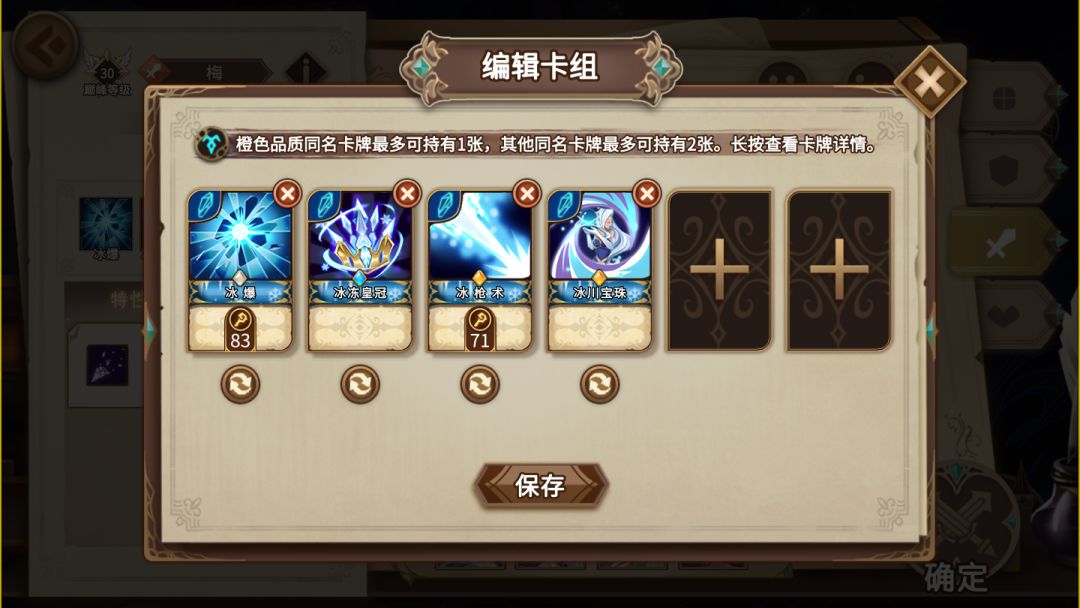仅次于遗忘尼克的开局号,用法是先使用索瓦的雷电法袍(天赋解锁)、双子的权杖(需天赋解锁全体buff增益)获取BUFF(有时候需要蔷薇的无敌甲),确定索瓦大招处于激活状态后先使用电击充能、再使用索瓦大招、双子的水晶卡等最大获取水晶的操作后,再用梅的冰川宝珠(45级后天赋解锁该卡牌,该卡牌强化后取消消耗词缀),然后就能用一大堆的冰枪灌伤害灌死对面了。