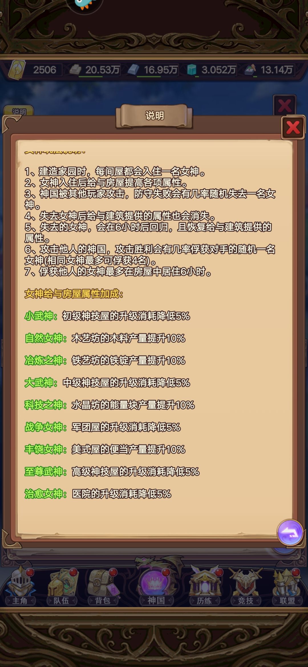 第一个建初级神技屋,3级了才可以建木艺坊,以此类推建6个就可以开大地图了,这里我们先不要建6个我们就五个就好了,当然你要是战力高的,不怕被打可以开大地图抢资源,我们低战力的就不要开大地图了,我们猥琐发展,我们需要的材料资源矿都开通了,就慢慢的发展,初级神技,和中级神技就可以了,等到神技差不多了,资源累累积的可以开通军团了,在开大地图,这样不怕被抢,还能一鸣惊人。