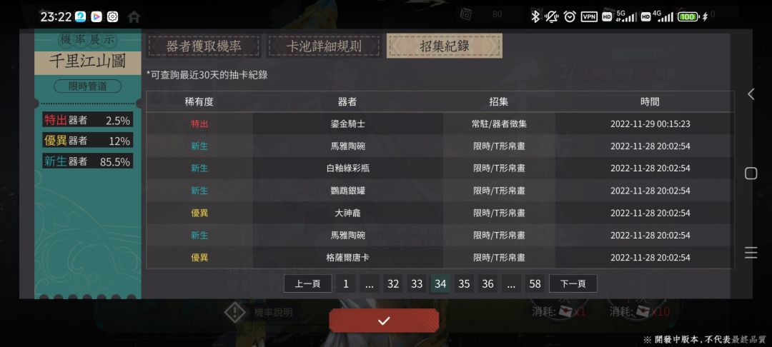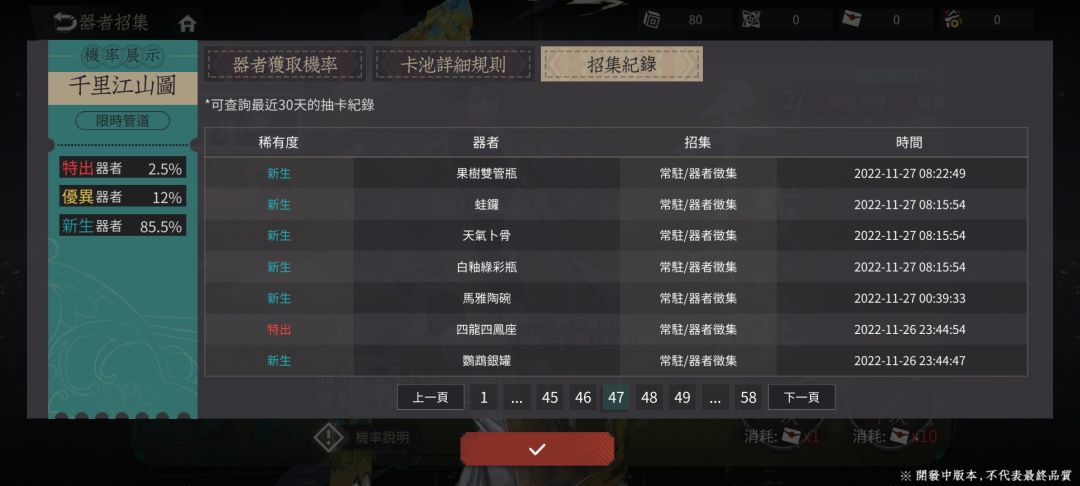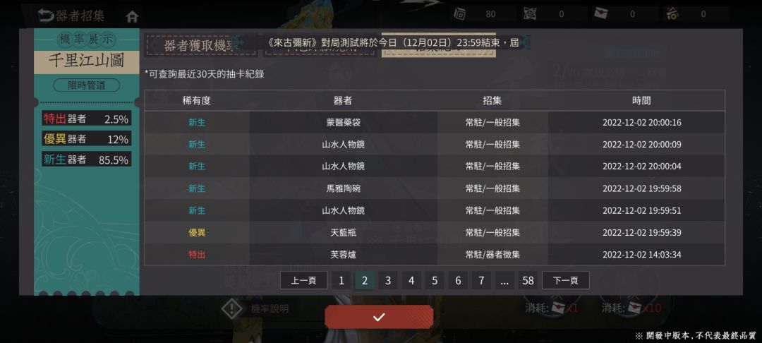 器者一共三种品质:新生(蓝卡)、优异(金卡)和特出(红卡)。十连必有一金及以上,红卡出率2.5%(不含保底)。50抽不出红则按1抽5%累增,70抽保底(实际上60以内出的概率就极大了,不然是真的非)。两个up池,每个池都是单up,up器者占出红的一半(1.25%)。两个up池保底次数共享,且均与下次up池继承保底。从本测来看,当期up池结束后,该up器者会进入下期的up池,有几率歪出。up器者不会加入常驻池。