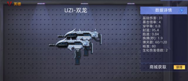 UZI-双龙:手持双Uzi冲锋枪,备弹量高,射速快,轻便携带威力巨大非常强劲的冲锋枪,拥有超高的射速,在生化模式中可以对瞬间打出大量伤害。