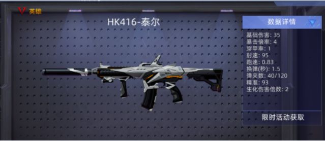 HK416-泰尔:泰尔科技公司的最新科技成果,科技感与威力十足,象征着泰尔科技最强战力武器,驰骋战场,无可匹敌!拥有百分百的穿甲率和超高的射速,加上稳定性也非常高,绝对的神器,外观也非常的帅气,喜欢的小伙伴不要错过哟!