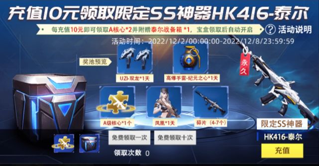 今天小白来为大家讲解一下这次最新活动怎么获得ss级武器HK416-泰尔(活动时间2022年12月2日到2022年12月8日)每充值10元就可以领取A级核心*2加泰尔战备宝箱*1,领取到之后宝箱会自动开启。泰尔神射战备箱内奖励包含(HK416-泰尔、UZI-双龙、高爆手雷-纪元之心、凤凰、A级碎片、可合成碎片)