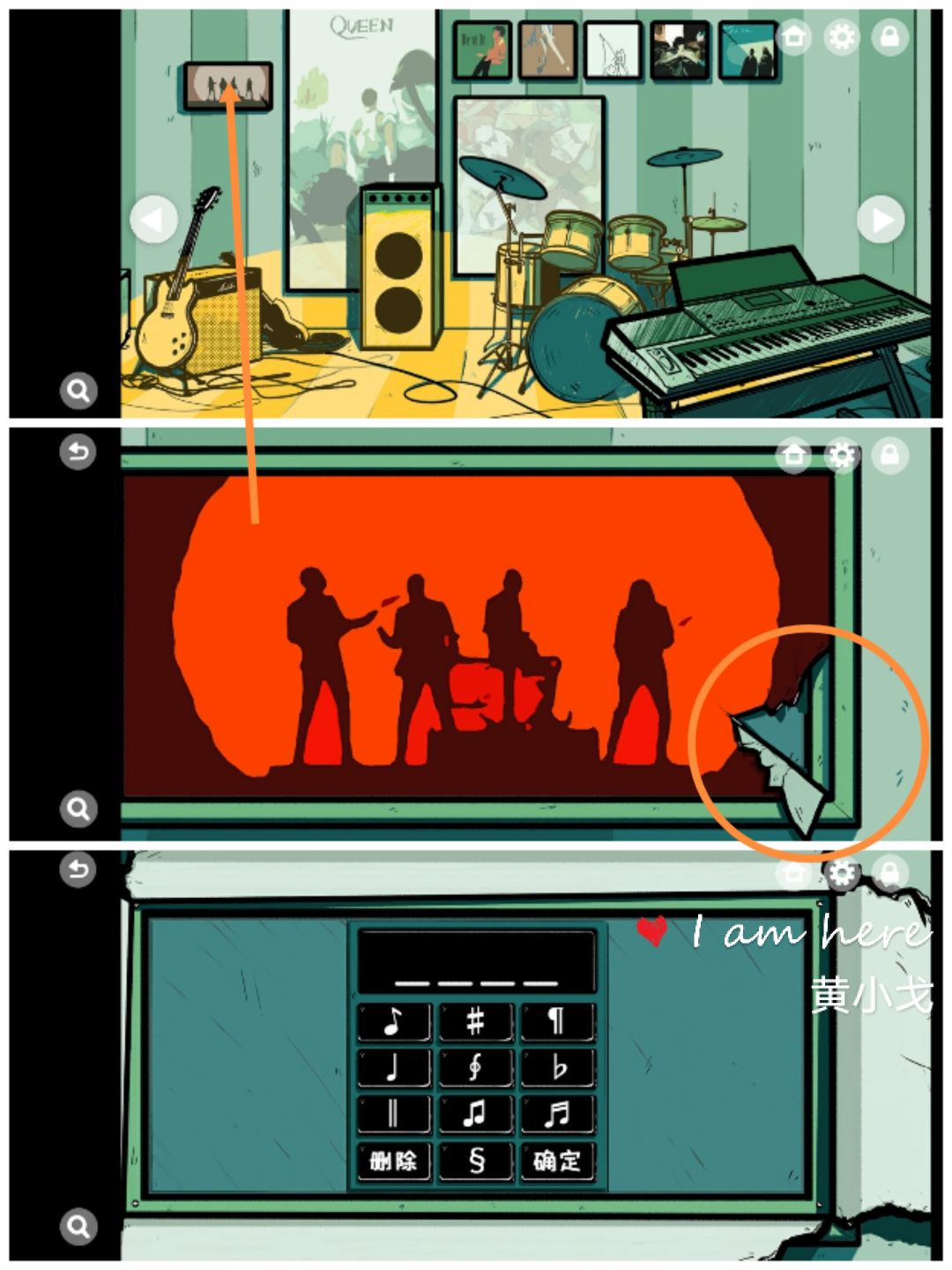 1.(放乐器的房间)点击墙上的乐队合影,撕掉照片,看到有奇怪图案的密码箱