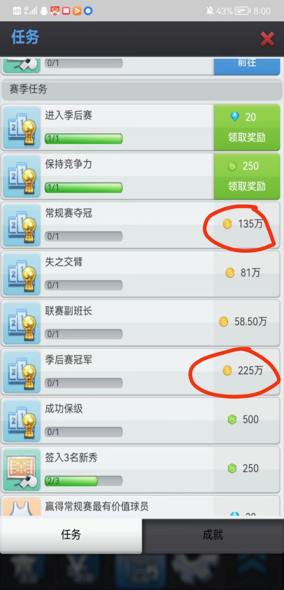 如下图所示,成就中常规赛和季后赛夺冠金币奖励很高,需要注意:夺冠后不要马上领取奖励,等升联后金币奖励也会随之变高,这时再领。这是前期能够大幅增加金币的重要方法。