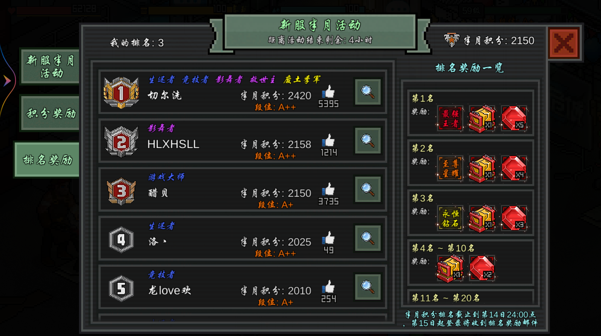 能用肝做的任务都做了,第一是氪佬,第二随时可能易主,前三是稳了(所以他多出来的3是咋回事,任务积分不都是+10+15+20吗?)