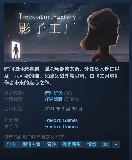 2011年,《去月球》正式上线。现在回看2011年的独立游戏榜单,会觉得那是一个群星熠熠的阶段,《泰拉瑞亚》《堡垒》《三位 一体2》都在这年推出。这些游戏,不管是可玩性还是画面,都是比单纯的像素画风、叙事游戏要更好玩,画面表现要更有冲击力。但还是有一群玩家,认为《去月球》是他们心目中的神作,玩了以后令人上头,在评论区留下自己的故事,告诉作者,这款游戏打中了他们心中最柔软的地方。