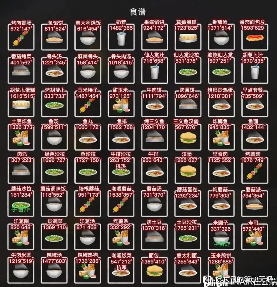 注:实际上不需要食谱,有食物材料就可以直接做,本帖提供食物首次效果,所需材料及具体位置,但数量较多,翻着费劲,如果只是收集食谱不看效果,其他大佬的帖子也许更适合。(ー_ー)!!