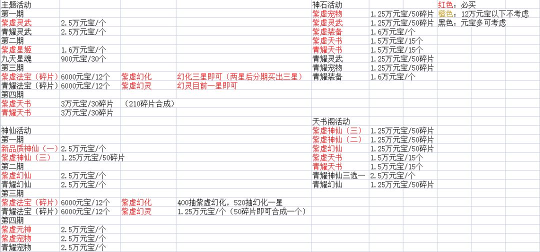主题活动的青耀灵武从橙色下调为黑色,神仙活动的紫虚法宝从橙色上调为红色,天书阁的青耀神仙三选下调为黑色(之前忘改了),星姬的元宝数量之前有误(特别鸣谢南冠自在客大佬的纠错)