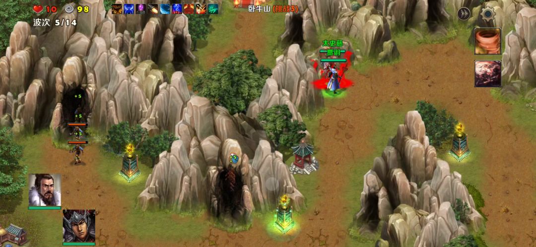 打法思路:全程14波没有空中部队和投石车,我们可以在出兵口位置建造天雷塔进行遗漏收割,战斗开始以后把两位英雄调到右边出兵口靠左边的位置刚好太史慈和贾诩可以打到刷兵营地。太史慈技能不要停全程就算有遗漏的兵也很少一两个出兵口的防御塔可以轻松收割,当然金币留着也没用就把其他地方都铺上防御塔就可以挂机了