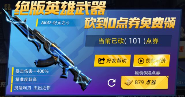 这个白嫖活动可以,通过好友砍价和视频砍价两中方法进行砍价,可以永久减少购买金额,不过好友砍价和视频砍价每天有次数限制,我们通过每天砍价砍到0点券就可以免费白嫖了哟!下面小编来介绍一下这个活动可以获得的神器吧加特林-克煞:生化利器,加特林-克煞专克生化异形,在生化模式中有额外伤害加成!基础伤害30,暴击倍率4,穿甲率0.7,射速95.8,跑速0.65,换弹4.5,弹夹数160/320,精准50,生化伤害倍率1.6。它的外观是一款有着银色枪管,枪身整体为暗金色有着蓝绿色的花纹镶嵌的机枪,从它的外观看就有一股威严镇邪的气势!拥有超高的射速和载弹量,在生化模式中可以形成强大的火力压制异形克星名副其实!
