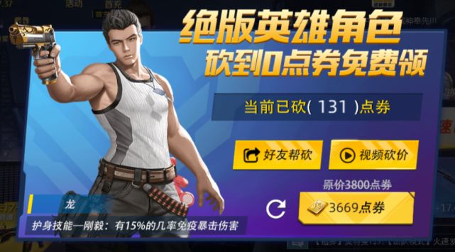龍:首个英雄级角色,拥有强大的护身技能——刚毅:有百分之15的几率免疫暴击伤害。“我叫龍,不叫铁头”S级英雄角色,在对局中有概率可以免疫敌人的暴击伤害,幸运的话可以免疫对手的爆头伤害从而进行反杀哟,现在可以通过砍价活动获取,可以通过每天刷视频白嫖哦。