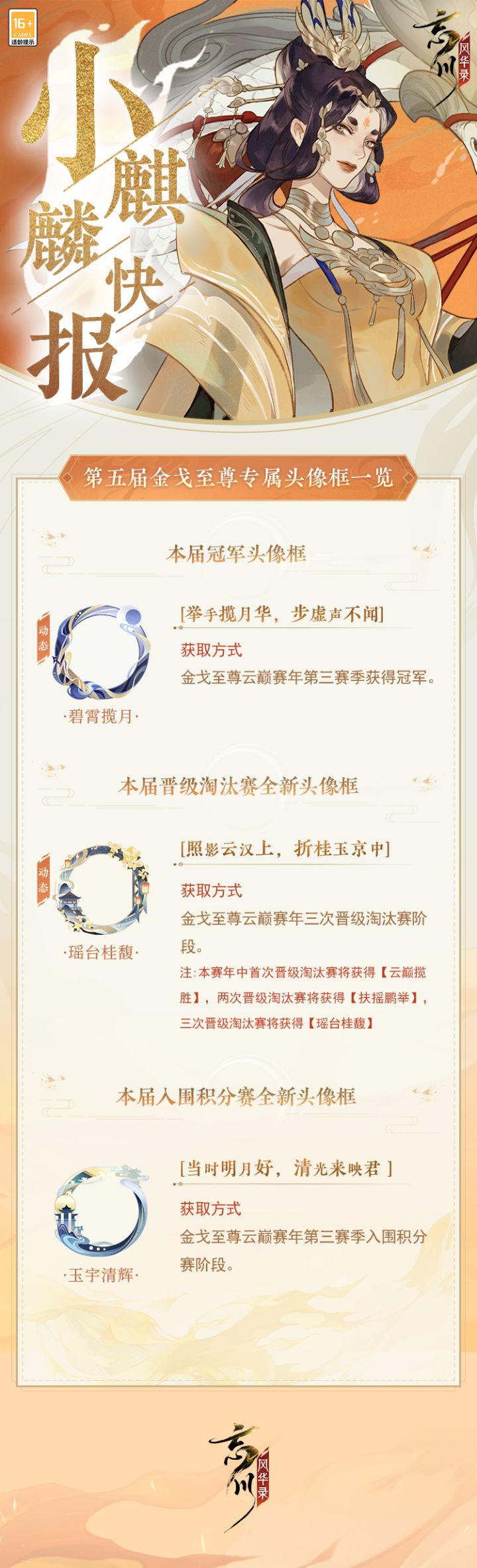 第五届金戈至尊海选阶段已于今日早6:00结束,积分赛同步开启!为感谢各位使君的热情参与,小麒麟抱来了本届金戈至尊专属头像框展示~