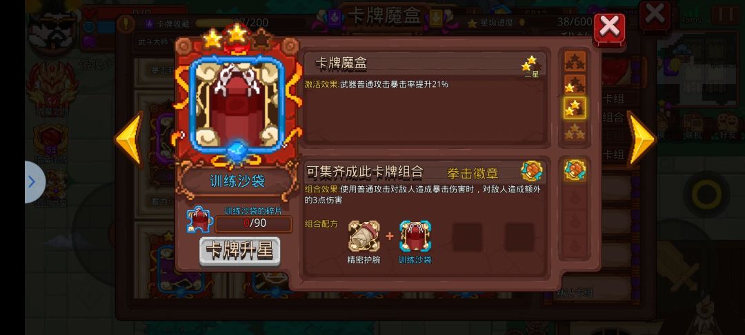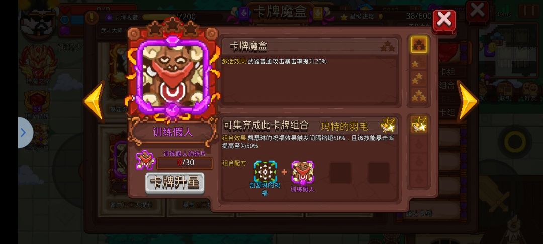 当然,我们可以看到触发前提是【暴击】所以在这里推荐携带以下卡牌。【训练假人】和【训练沙袋】提供20%左右的普攻暴击率,两张卡牌激活后加上局内武器自带的暴击,轻松到达至少50%暴击。