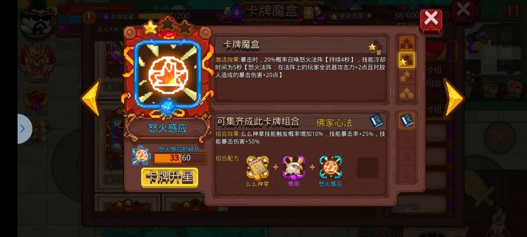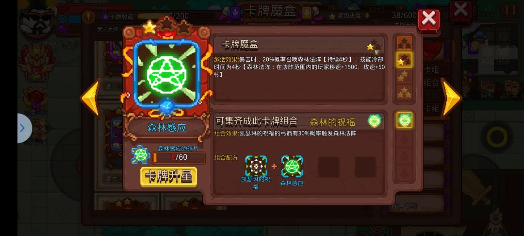 【怒火感应】和【森林感应】则是buff卡,也是通过暴击触发,前者可以增加你的武器攻击力和爆伤,后者可以增加移速和攻速。