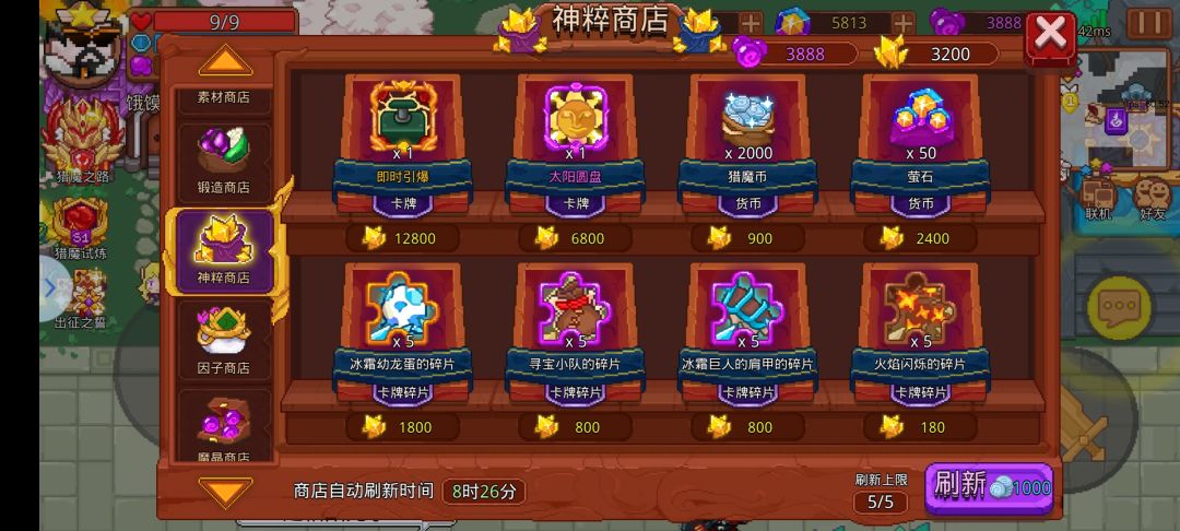 其次就是【神粹商店】,每天有5次刷新次数,有概率刷出【金色整卡】,如果神粹差很多就没必要强抽强买,不如留着等池子。