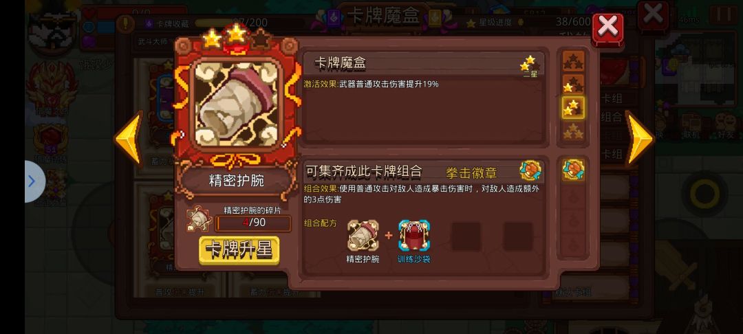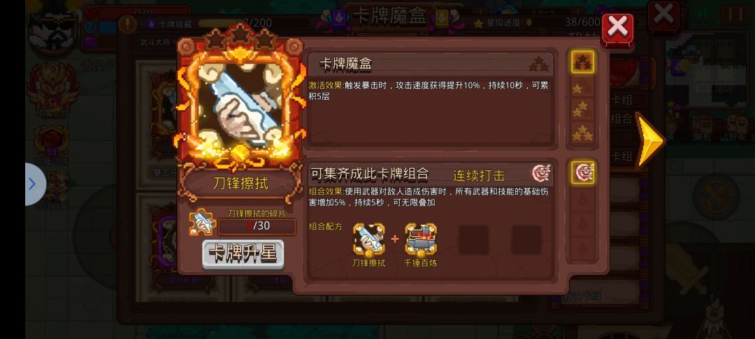 ①在这里首推【武斗卡组】,武斗套中的【千锤百炼】和【刀锋擦拭】是最重要的,并且只有这两张卡同时拥有并激活才能发挥出武斗最强效果。这两张卡牌都是通过暴击触发的,暴击可以加攻击和攻速。