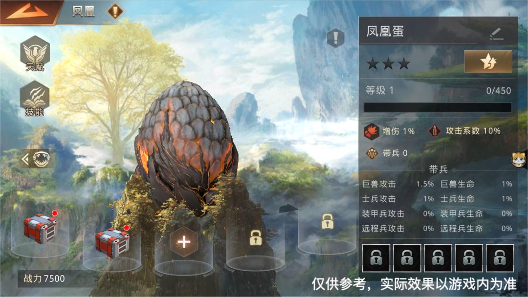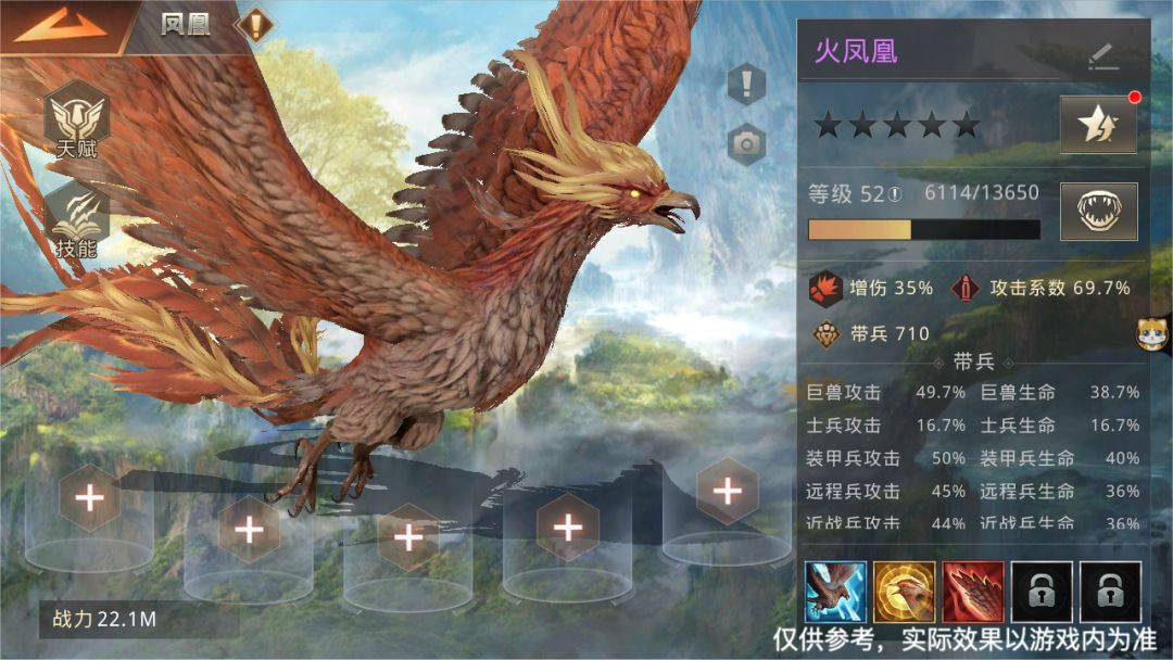 凤凰可通过升级天赋获得不同的战斗技能。进化阶段和星级越高,凤凰可携带的战斗技能数量越多(上限为5个)。出征时,凤凰无需上阵也可同时参与所有部队的战斗,并为全部部队提供属性加成。